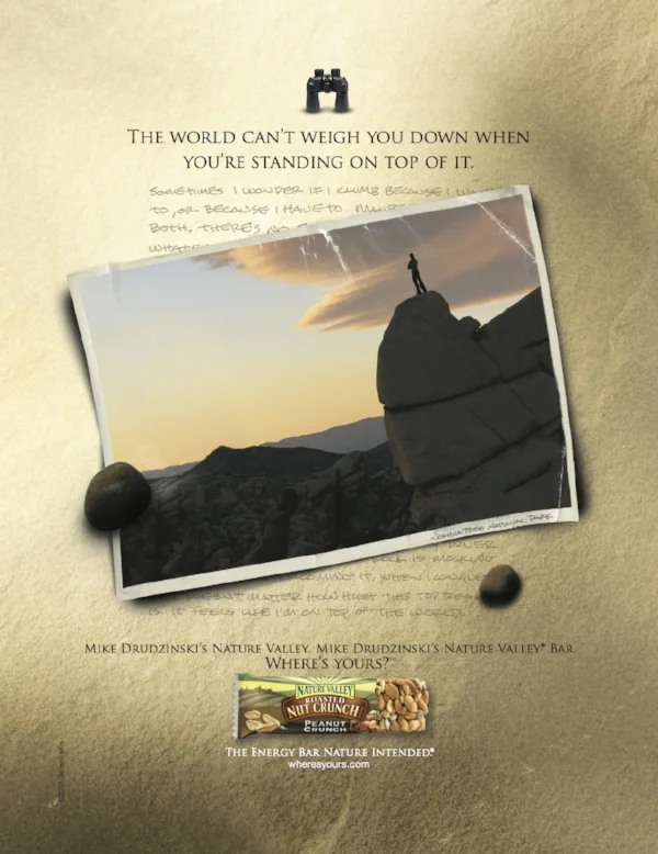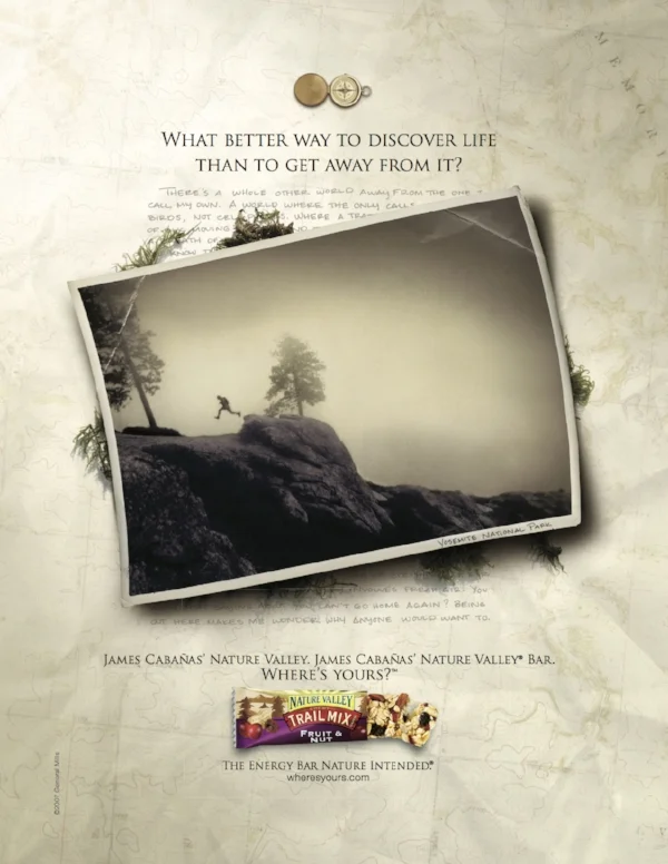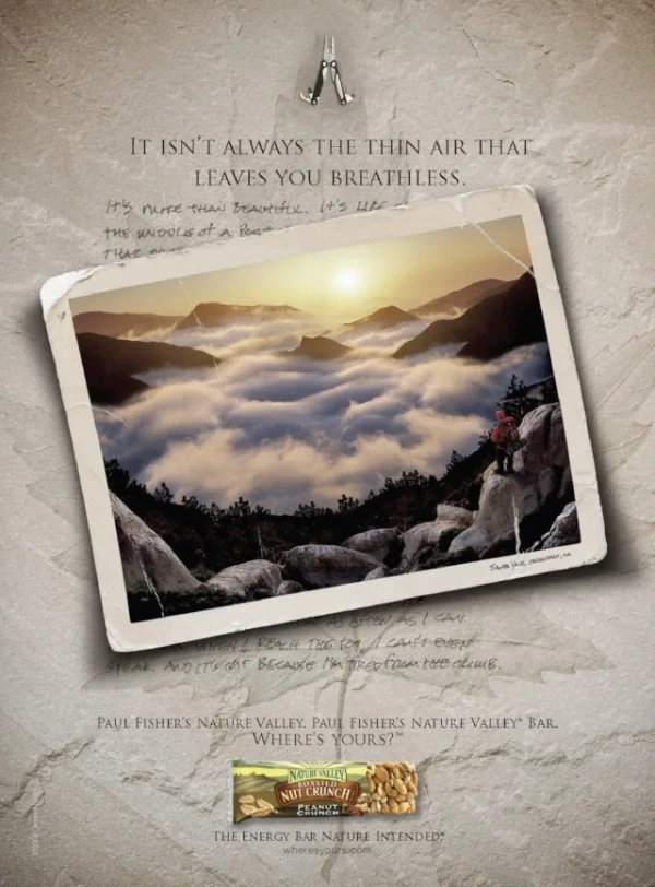 Nature Valley granola bars are 100% natural. Fittingly, they’re a favorite of people who love nature, like hikers and campers. So we asked nature lovers to tell us about their favorite spots in nature with the question, “Where’s Your Nature Valley?” They told us in droves. Then we captured those places in our advertising and used the people’s names who submitted the locations and told us their stories.